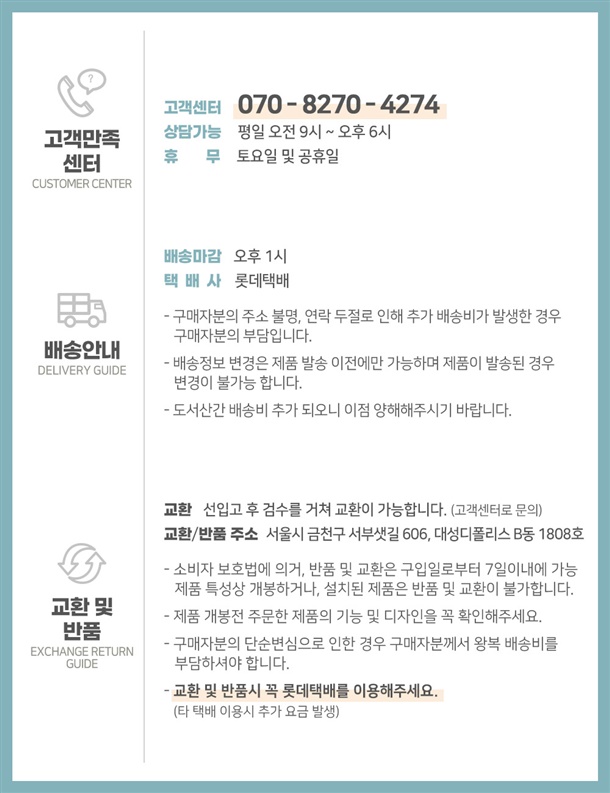 · 상품 불량 사유와 사진을 남겨 주시면 빠른 처리가 가능합니다.